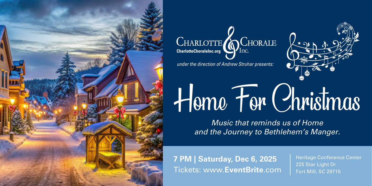 Step into the warmth and wonder of the season with "Home For Christmas", on Saturday, December 6th beginning at 7:00 PM, presented by the Charlotte Chorale under the direction of Andrew Struhar. The concert will take place at the Heritage Conference Center. This 75-minute performance, complete with an intermission, invites audiences to experience the many moods of Christmas, from bustling city sidewalks to the quiet reverence of Bethlehem.